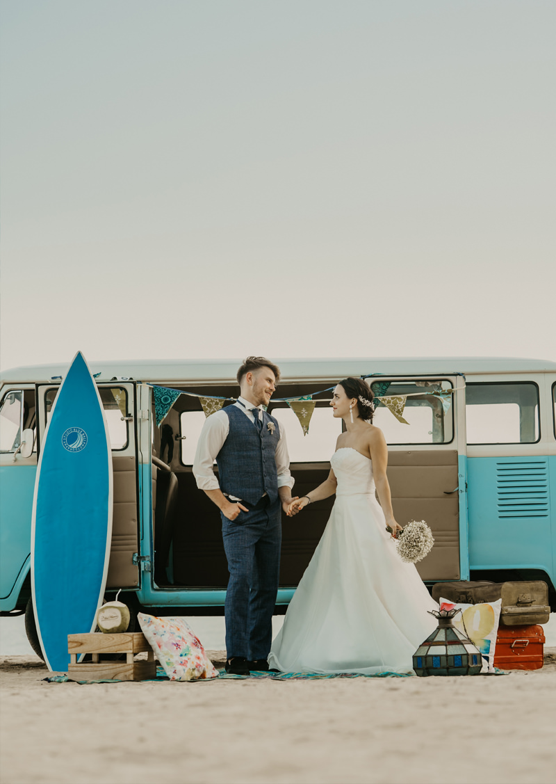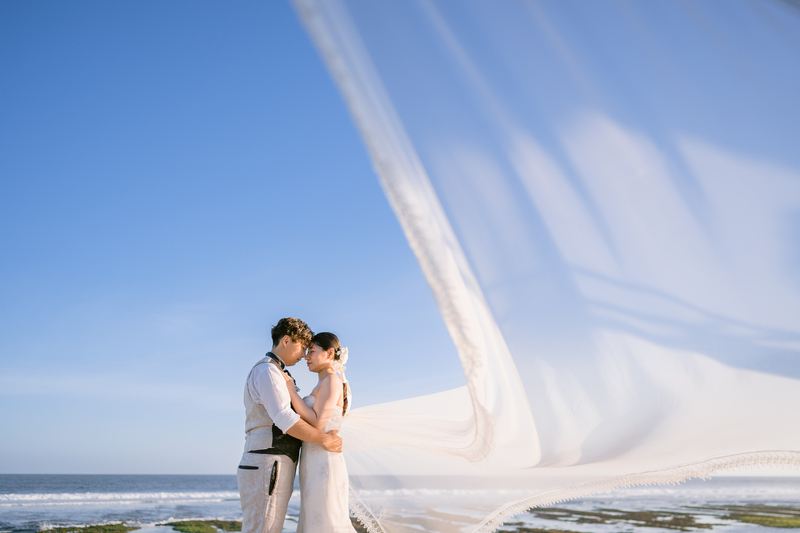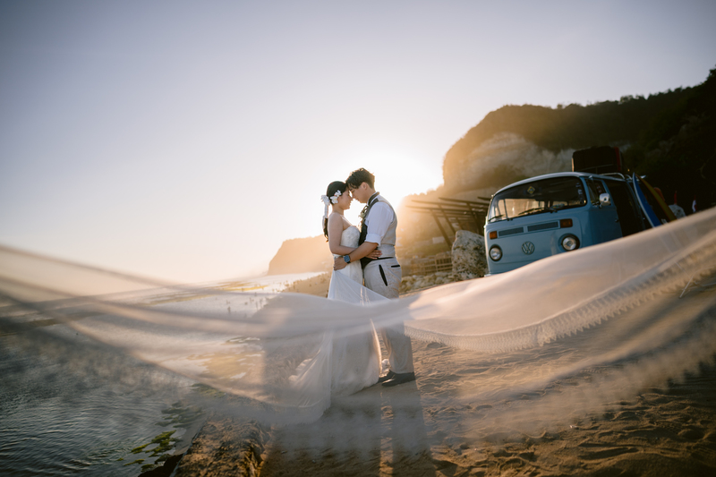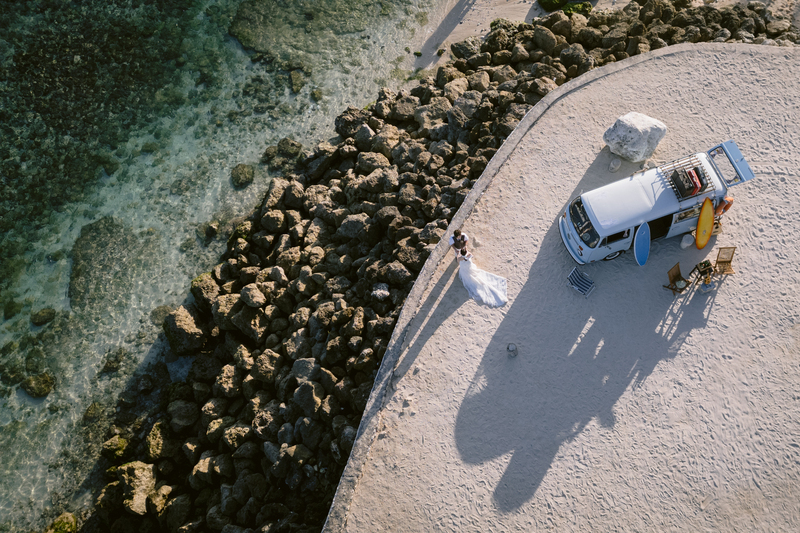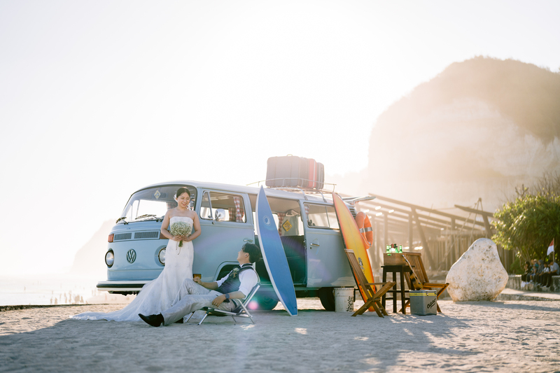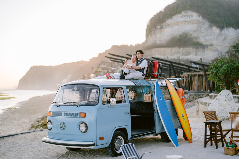 バリ島屈指の透明度を誇るプレミアムビーチ<メラスティ>で撮影するビーチフォト。通常のビーチフォトではできないヴィンテージカーやピクニックセットで人とは違うラグジュアリーなフォトウェディングを。